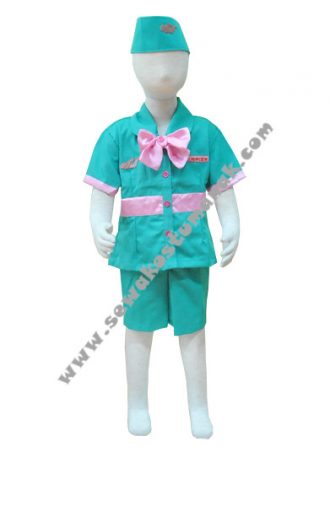 Kostum pramugari anak berbahan katun drill berwarna hijau tosca dan aksen pink. lengkap dengan aksesoris dasi dan topi. Tersedia untuk ukuran anak playgroup. Kostum bisa dikirim lewat gojek/jne.